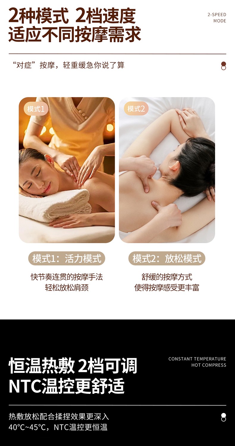 4.2种模式,两档速度,自由选择,40~45℃恒温热敷,两档可调