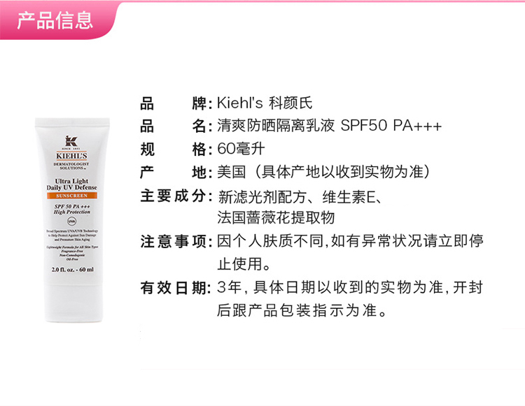 代发科颜氏(Kiehl's)柔润防晒乳60ml小橘盾干皮敏感肌